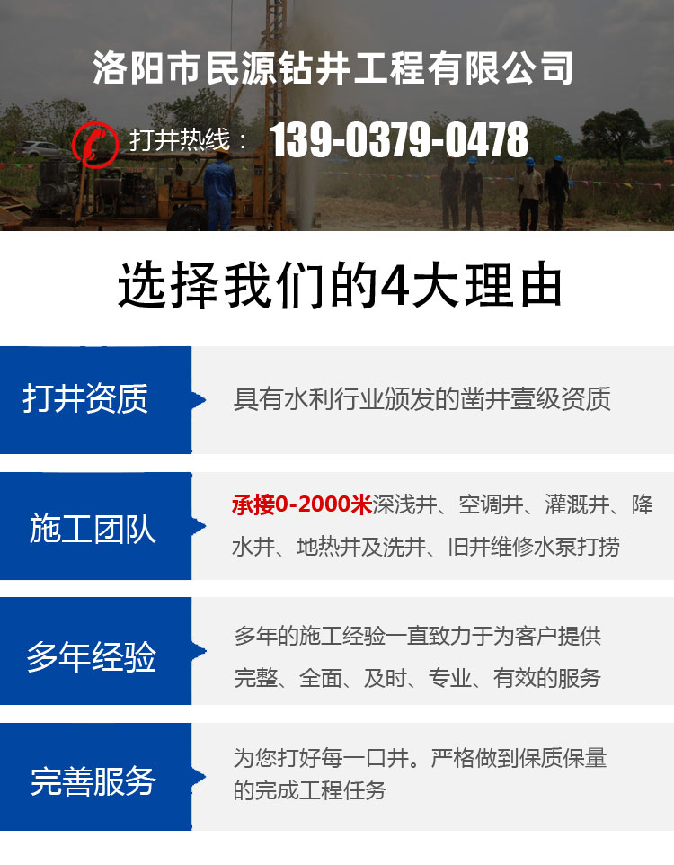 洛陽市民源鉆井工程有限公司是技術過硬、經(jīng)驗豐富的施工團隊,具有鑿井行業(yè)壹級資質證書,擁有水鉆400、300鉆機、空壓機、打樁機、潛孔錘十余臺;適用于農(nóng)家打井、農(nóng)田打井、機關單位打井、企業(yè)廠家打井、以及各種工程工地打井。